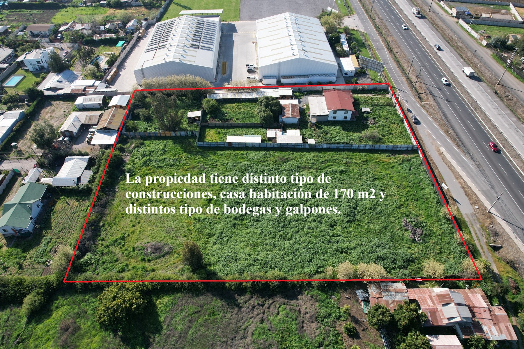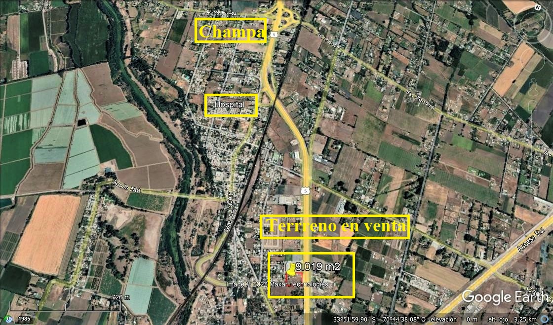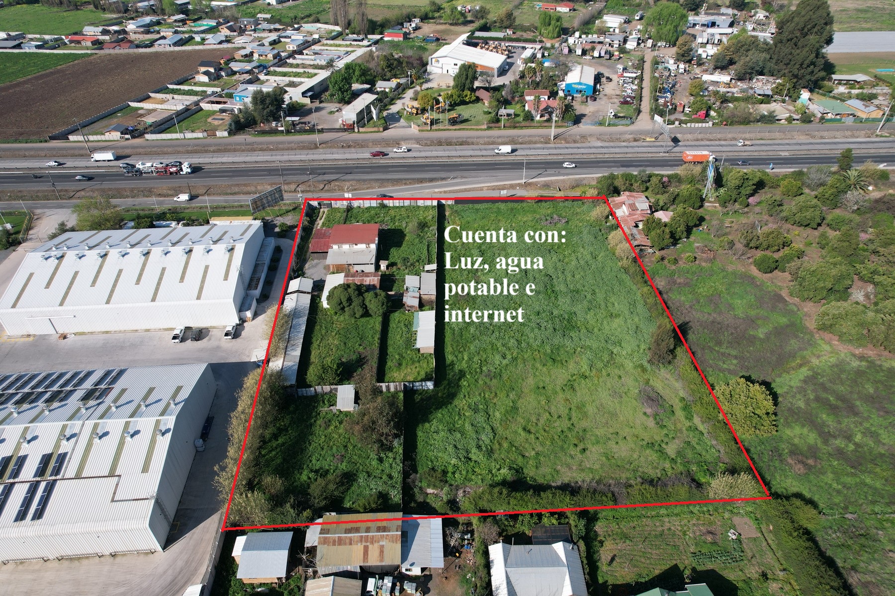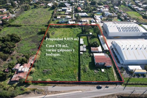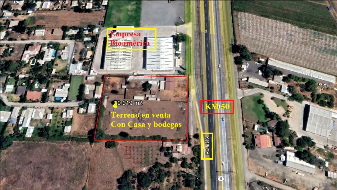 Terreno con excelente ubicación de 9.019 m2, lado poniente de la Ruta 5 Sur Km 50, con 85 metros de frente. Con muy buenos accesos y salidas a la autopista. Tiene agua potable, luz eléctrica, casa de 230 m2, bodega y galpón.